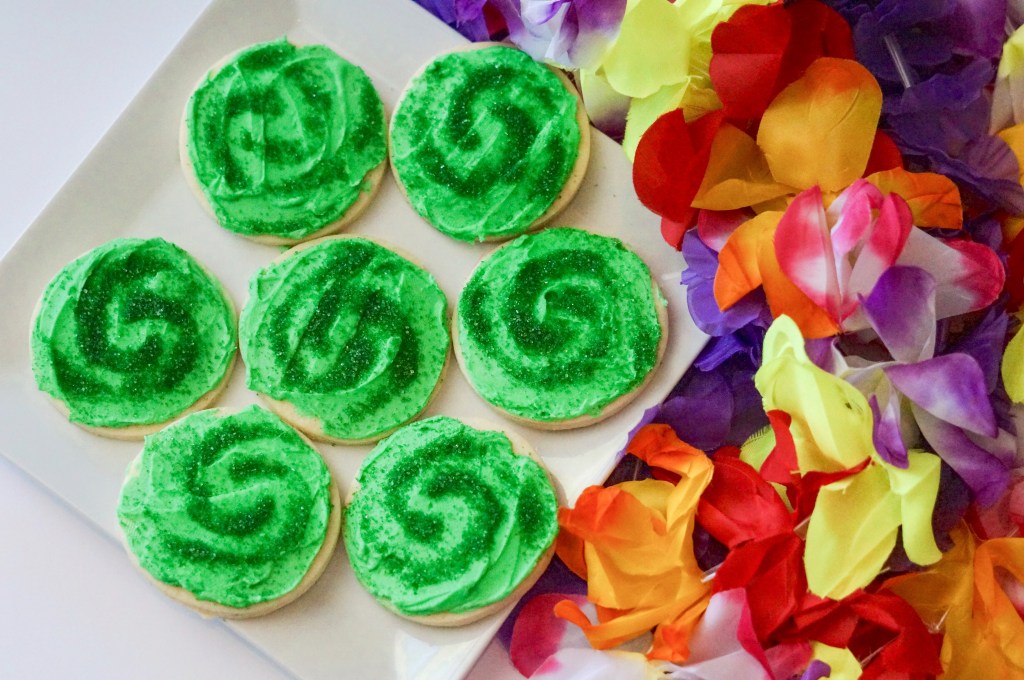 As I mentioned I love getting my inspiration from Pinterest. As the girls get older it has been helpful to include them on my searches! We scroll through together on my phone and they pick what they like. I really love when they see something that interests them but add a spin and make it their own! Peyton mixed two ideas together she found incorporating the Heart of Te Fiti. She invisioned cookies with green frosting and green sprinkles making the shape of the Heart of Te Fiti. Our friend delivered perfectly! These were my favorite part of the menu for both looks and taste!
