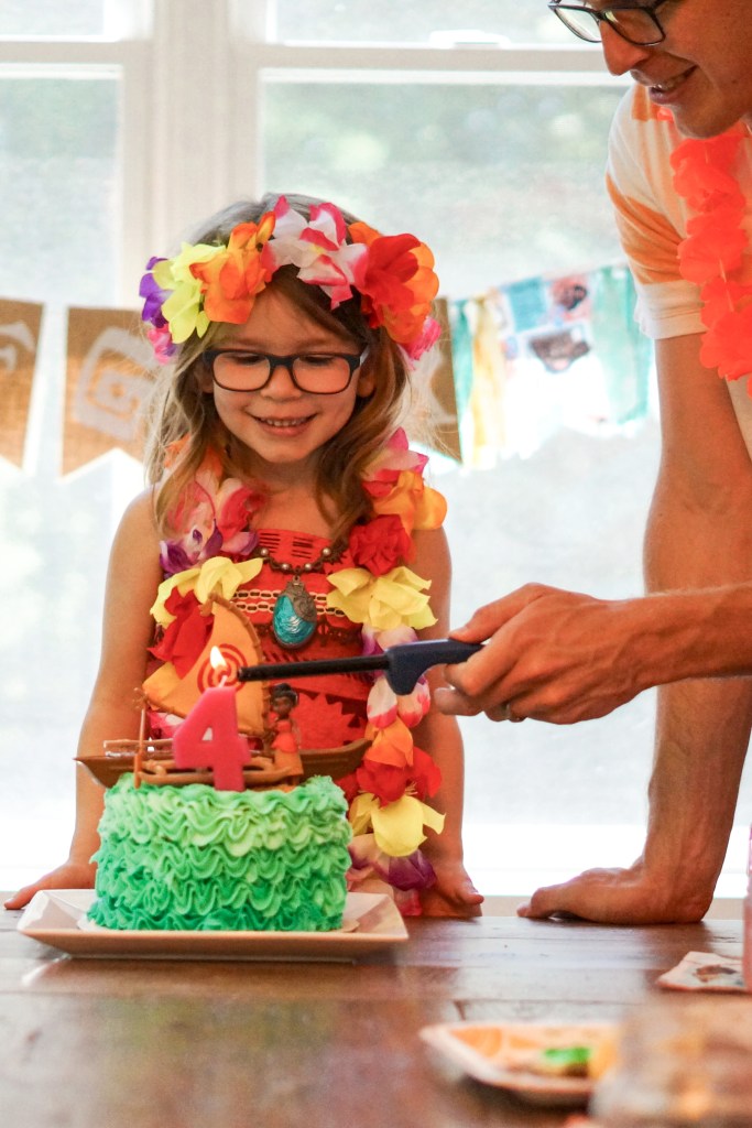 Her exact outfit is no longer available but here is a super cute one! There are so many now to choose from, I am slightly jealous five years later now! We also got her the Disney Kids Moana Singing Necklace. I even found this lei set for her “birthday crown” like Moana wears throughout the movie.