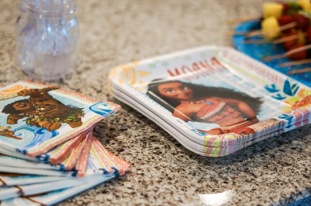 Dinnerware is an easy way to add to any theme for a party. Plates and napkins we go with disposable so the kids can pick out something fun, whereas cups I like to use what we have but add fun straws or toppers (this time we added drink umbrellas!). I hopped onto Amazon and they had what I needed. The Moana Party Napkins and paper plates I ordered were perfect. They were big in size, which is good for having a variety of food and mess. They also had both Maui and Moana which made our birthday girl happy.