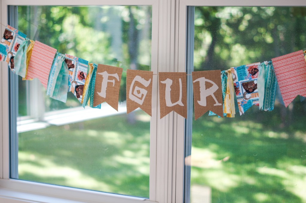 Using the same Moana font I spelt “FOUR” to personalize for our little girl. With a mixture of flags and scrap pieces I felt this banner tied the other two together making a cohesive package throughout the party.