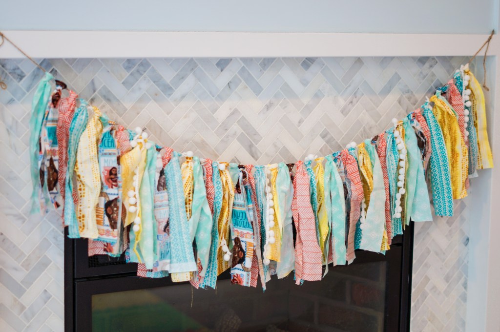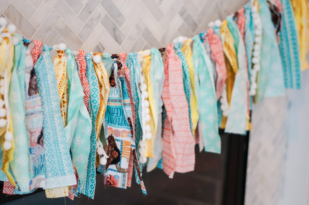 Back to decorations! I found some adorable Moana fabric at Joann’s and the same day was able to find the perfect coordinating fabrics as well! Pulling from my inspiration photos I decided a mix of text banners and scrap banners would be perfect.