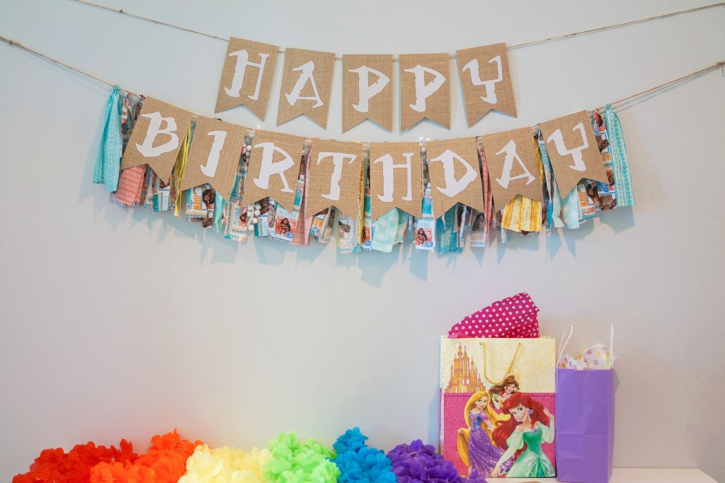 I always try and have one of the banners read “happy birthday”. The entry banner was perfect for this! I found a free downloadable Moana font and cut the letters using my Cricut Explore Air. The text banner itself was simple and plain, so I added a scrap banner behind with left over fabric to add a pop of color. We set the favor leis underneath on our entry table and exampled where to put the gifts as well. As the guests arrived Peyton matched them with a lei and gratefully took her presents!
