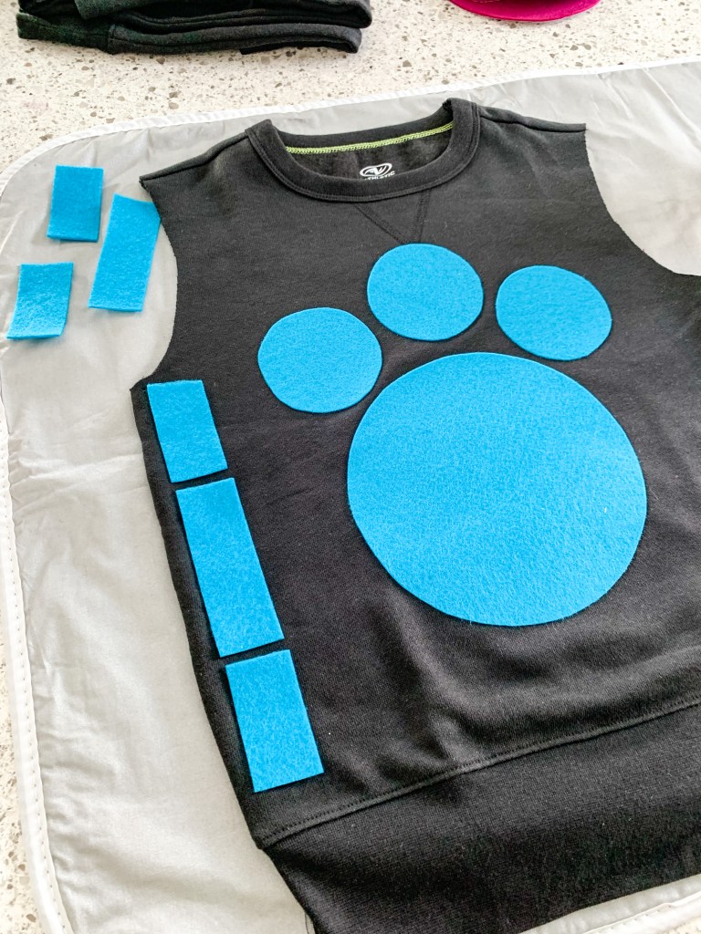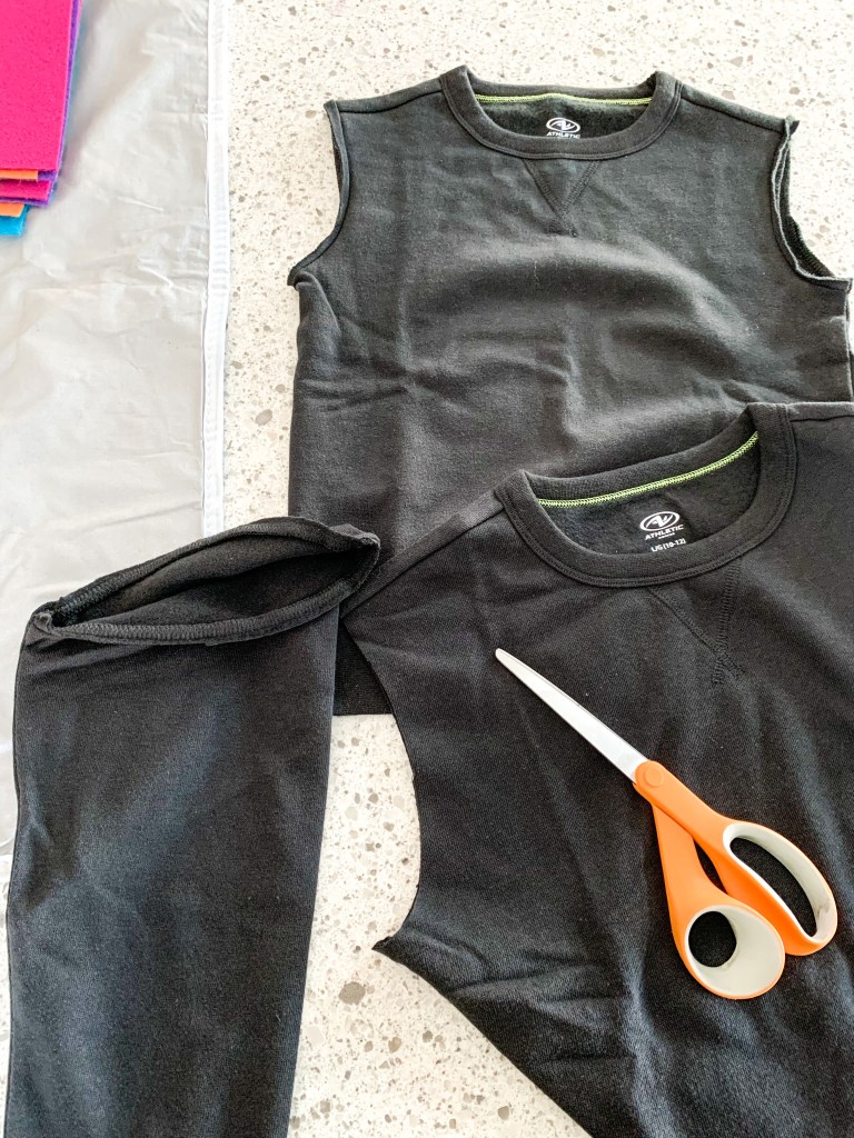 I started with cheap crew neck sweatshirts from Walmart. Not listed online but I found these comparable ones on Amazon. I liked using a sweatshirt over a t-shirt because it gave it more structure and strength for the creature patch that was coming later. However, to be a vest like in the show I cut off the sleeves. Make sure you have a good fabric scissors to make clean cuts! The scissors will also be important for cutting the felt too.
