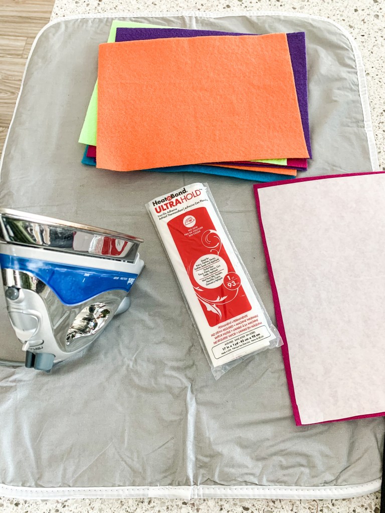 Speaking of felt! You will need felt sheets in your desired colors, I used two sheets per vest but had a little extra. Then, with your iron on the hottest setting WITHOUT steam, iron on adhesive backing to the full sheet. Take your time ironing and apply pressure to make sure it is well adhered to place onto your sweatshirt soon!