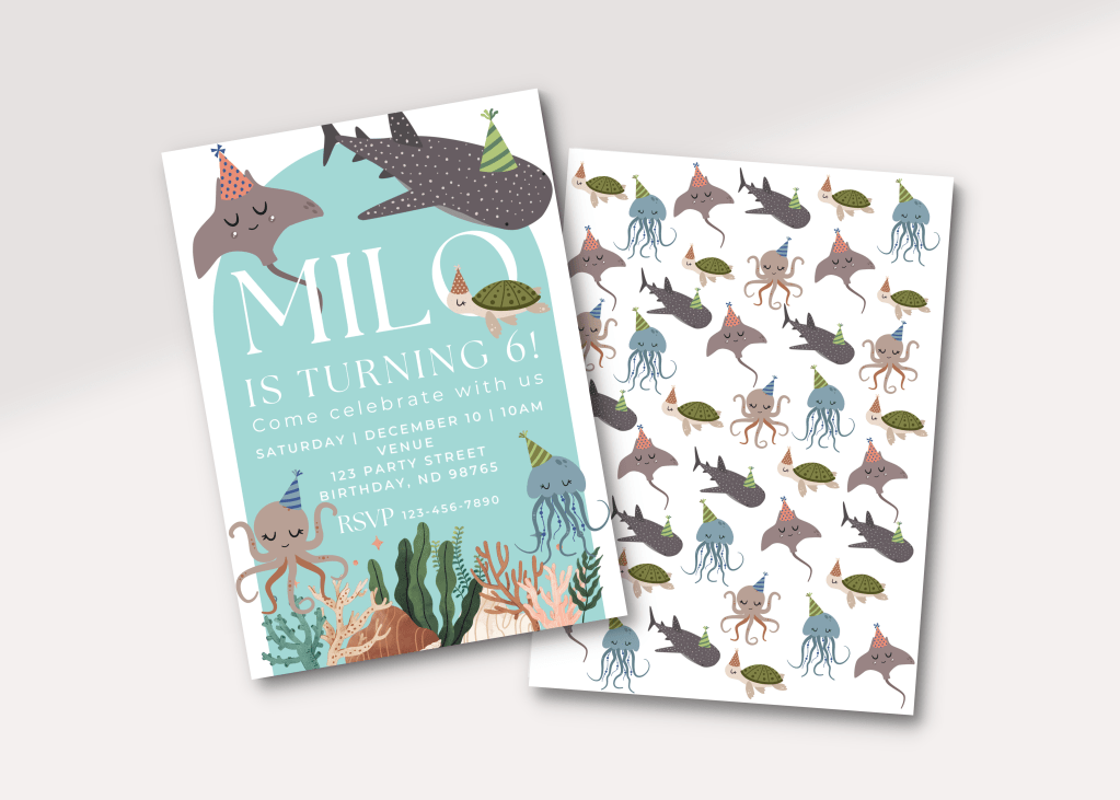 As a small business creator, I love making pieces for my kids’ birthdays when I have the ability. I wanted to try my hand at invites this time around. I knew with the party not at our home, plus coming back from a vacation, I wouldn’t be able to do a lot of DIY decor and supplies. I have to say, I LOVE how these invites turned out. So much so I added them to my Etsy shop and Zazzle for others to use 🙂