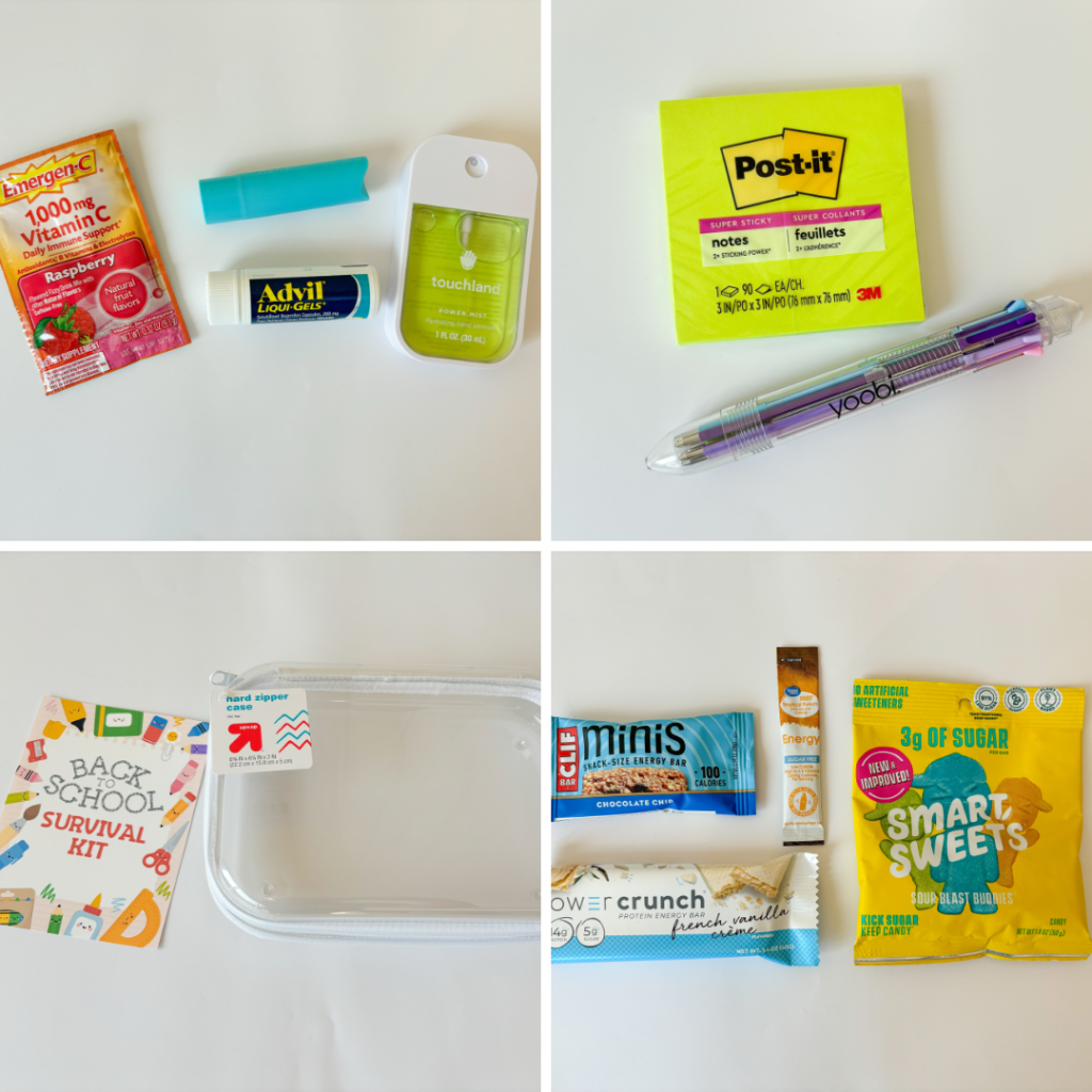 Emergen- C | EOS Lip Balm | Travel Size Advil | Touchland Hand Sanitizer | Post It Notes | Yoobi Multi-Colored Pen | Mini Cliff Bars | Power Crunch Bars | Energy Drink Mix | Smart Sweets | Hard Zipper Case | Printable Gift Tag